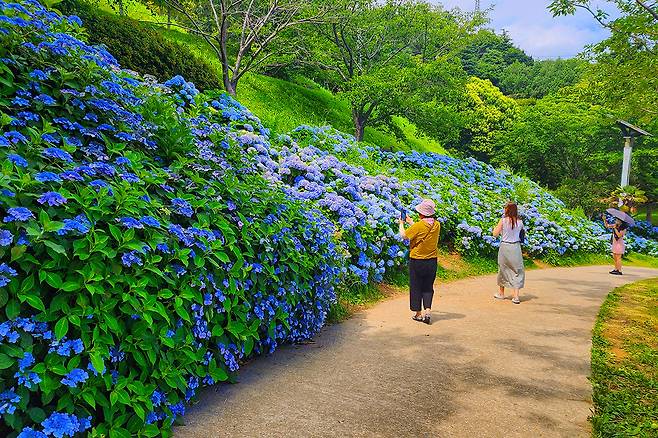 특히 공원 화장실 주변의 수국 군락은 마치 몽실몽실한 구름처럼 피어올라 방문객들의 발길을 멈추게 만든다.