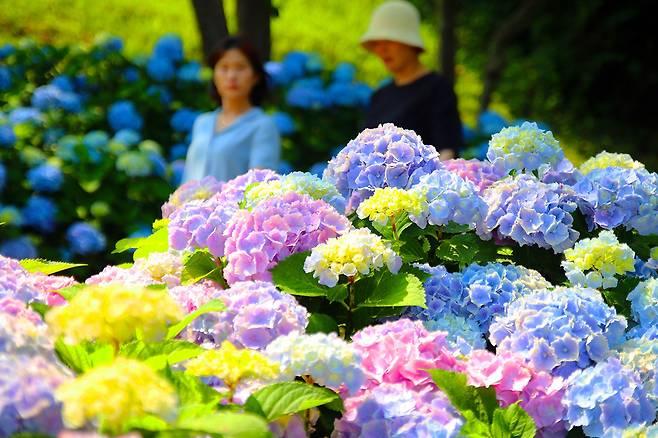 여름이 다가오면 통영의 이순신공원은 형형색색의 수국으로 물든다.