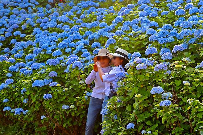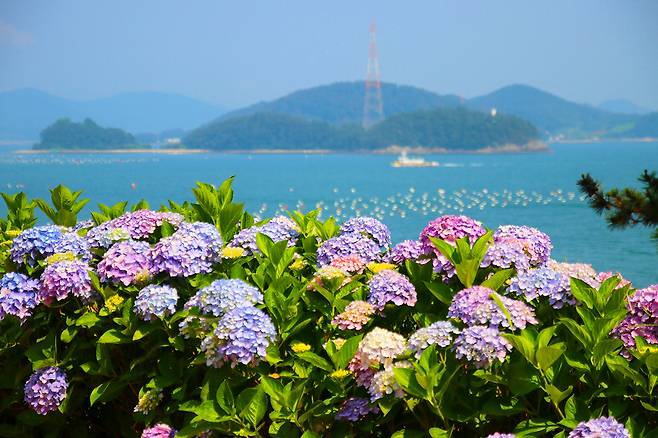 푸른 바다를 배경으로 형형색색 피어난 수국은 어느 각도에서나 아름답게 담기며 한산도의 푸른 바다와 어우러져 시선을 빼앗는다.