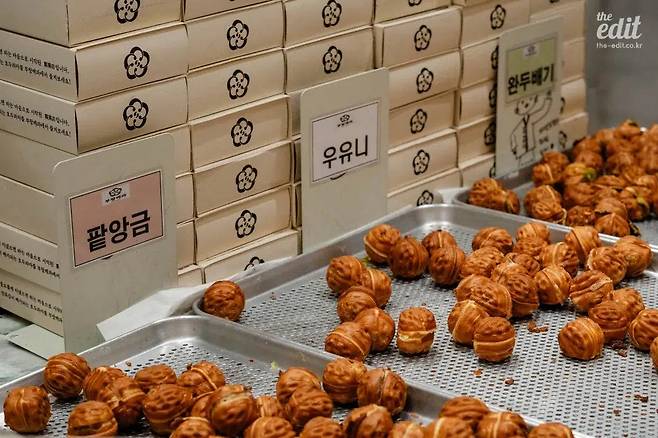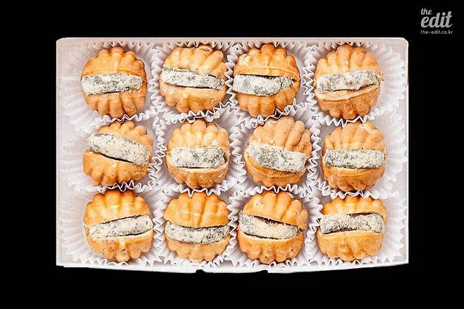 부창제과는 앙금 맛이 다양했다. 신세계 강남 스위트파크점은 호두과자 맛의 정석인 팥앙금, 꼬수운 단맛을 간직한 흑임자와 인절미, 완두콩이 쏙 담긴 완두배기, 그리고 슈크림 붕어빵을 떠오르게 하는 우유니 소금맛을 선보였다. (우유니 소금맛은 무슨 이유인지 이름과 달리 짠맛도 감칠맛도 거의 느낄 수 없었다.) 스위트파크점의 경우, 요일마다 매장에서 다루는 앙금이 달랐다. 부창제과 호두과자의 모든 맛을 경험하고 싶다면 여러 번 방문해야 한다.