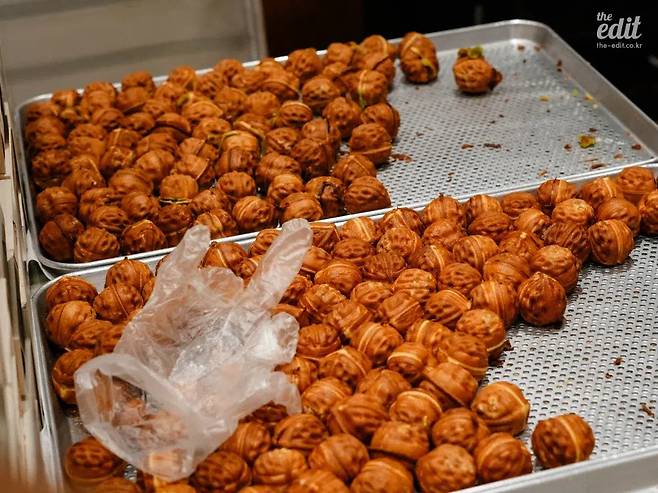 호두과자. 호두 모양 틀에 밀가루 반죽을 붓고 그 위에 호두조각과 팥앙금을 담아 노릇하게 구운 구움과자 디저트. 한국 사람이라면 적어도 고속도로 휴게소에서 한 번쯤은 먹어본 국민 간식이다. 그런데 호두과자가 원래 줄 서서 먹는 음식이던가?