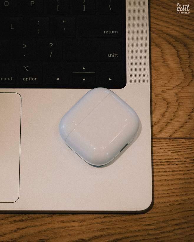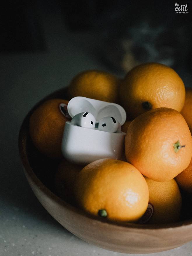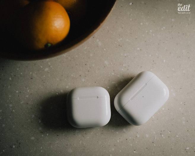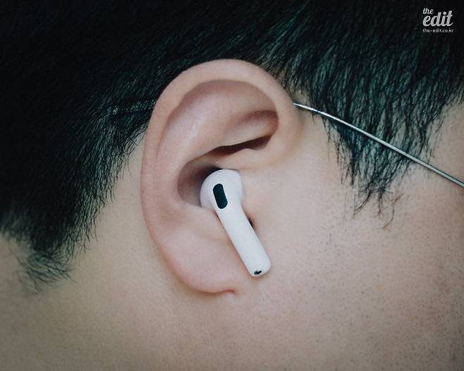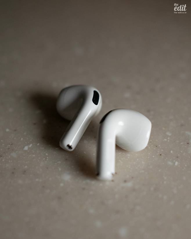 에어팟 3와 비교를 해보면 조금 더 날렵해지고 각진 모양새입니다. 애플은 약 5,000명의 귀를 스캔한 자료를 토대로 다시 디자인했다고 밝혔는데요. 이어폰을 잡아주는 이어팁이 없는 특성상 많은 사람들의 귀와 잘 맞는 것이 중요하기 때문입니다. 하지만 여전히 귀에 맞지 않을 가능성은 있을 테니 구매 전에 한 번 시착해보는 것을 추천합니다.