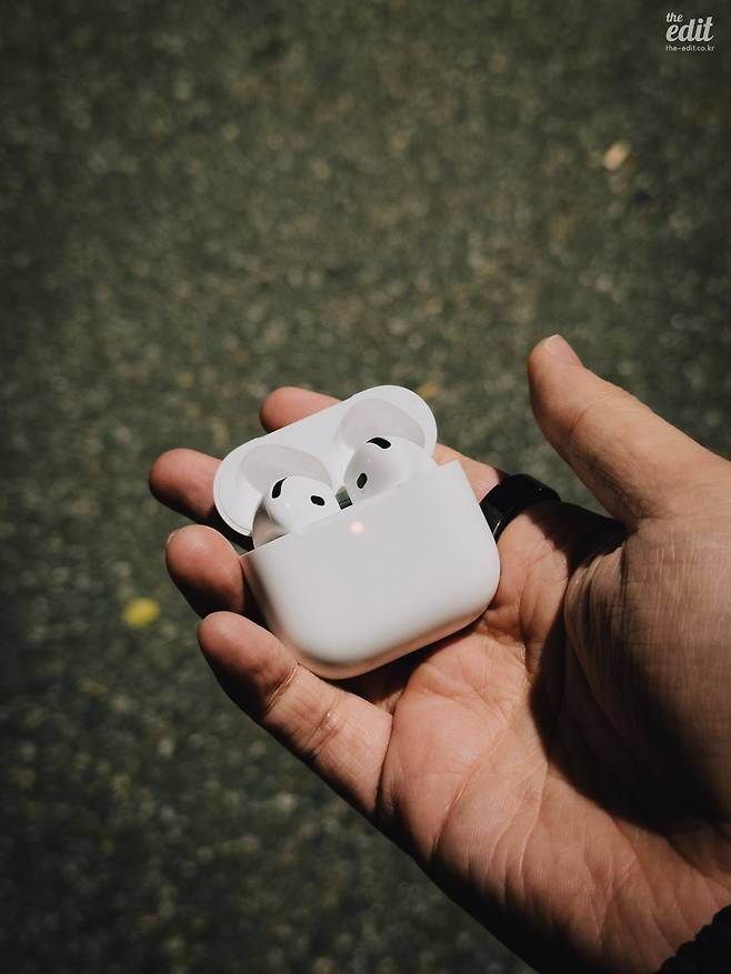 에어팟 프로의 밀폐형 디자인은 귀에서 이어폰이 쉽게 날아가지 않도록 잡아주는 느낌이 있는데, 에어팟 4의 오픈형 디자인은 귀에 걸터앉는 느낌입니다. 꽉 잡아주는 느낌이 없다 보니 떨어질까 봐 불안한 느낌이 들었죠. 하지만 결론적으로 약 2-3주 동안 줄기차게 에어팟 4를 낀 채로 여기저기를 돌아다녔지만 귀에서 떨어져 나간 적은 한 번도 없었습니다.