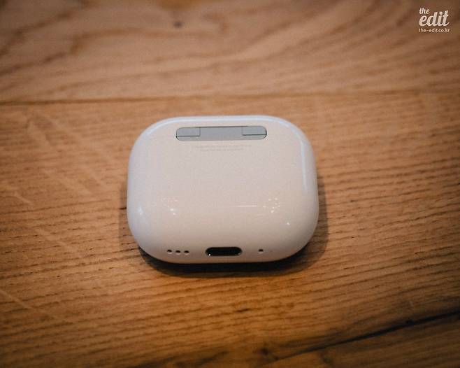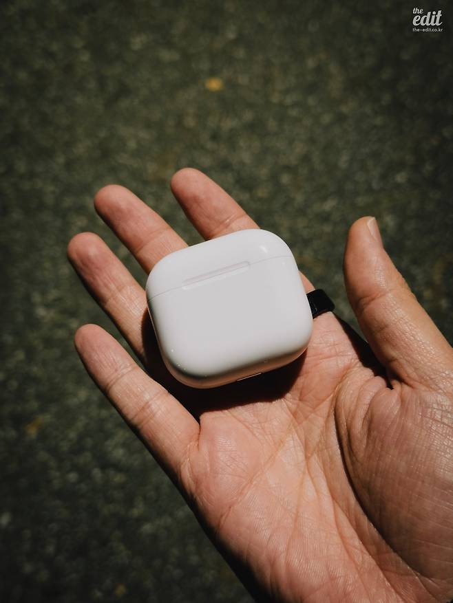 케이스의 전반적 모양새는 에어팟 프로 2나 에어팟 3와 다른 게 별로 없지만 은근히 많이 바뀌었습니다. 일단 눈에 띄는 건 크기. 에어팟 프로 2는 물론이고 에어팟 3 케이스보다도 작아서 휴대하기에 더 좋아졌습니다. 프로 2에 있는 스트랩 구멍이 없는 것은 아쉽지만 케이스로 충분히 보완 가능한 부분이죠. 이 휴대성이 프로 2와 비교할 때 상당한 이점을 가지고 있다는 생각입니다.