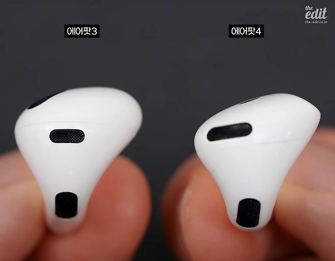 에어팟 4와 에어팟 프로 2의 가장 큰 차이점은 당연하게도 형태입니다. 에어팟 프로 2는 이어팁이 있는 밀폐형이고 에어팟 4는 오픈형이죠. 이 근본적인 차이로 인해 착용감도 상당한 다릅니다. 에어팟 프로 1세대부터 무려 4년 반의 기간 동안 프로만 썼던 제가 처음으로 에어팟 4를 착용했을 때 적응이 어려웠습니다.