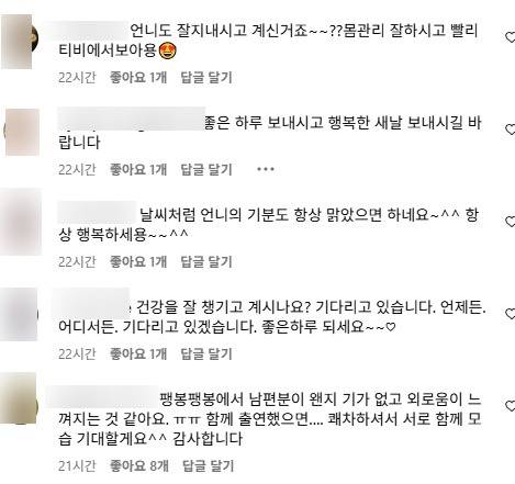 이를 본 사람들은 “잘 지내고 계시나요?”, “언니의 기분도 항상 맑았으면 하네요”, “기다리고 있겠습니다” 등 응원과 격려의 댓글을 쏟아냈답니다. 🥰