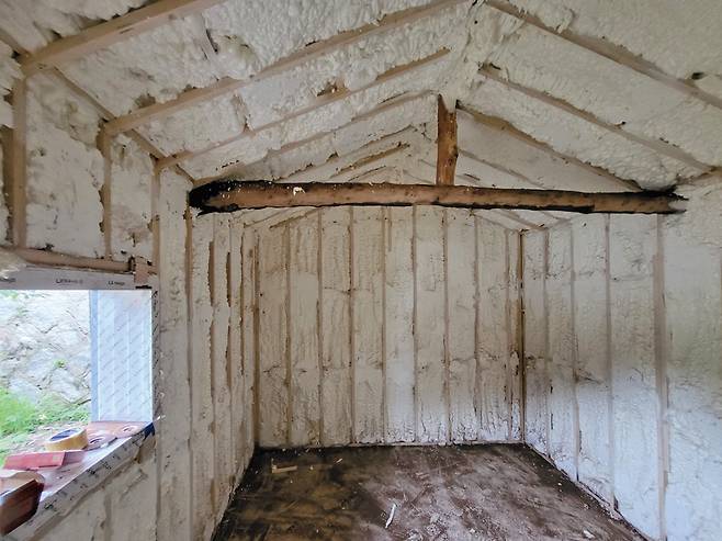 방통·단열 및 창호공사는 수성연질폼을 이용한 내단열로 진행한다. 내단열의 포인트는 기밀성에 있다. 즉, 빈 공간 없이 단열재를 연속적으로 시공할 수 있냐는 의미인데, 수성연질폼은 바탕면이 평활치 않은 리모델링 현장 여건에서 그 장점을 발휘한다. 단열재를 뿌리는 방식이므로 평활치 못한 바탕면에 균등하고 기밀하게 시공할 수 있기 때문이다. 수성연질폼의 단점이라면 습기를 흡수하는 성질로 인한 단열성능의 저하가 있다. 그러나 이는 습기의 사전 차단과 적절한 두께의 시공을 통해 보완할 수 있다.