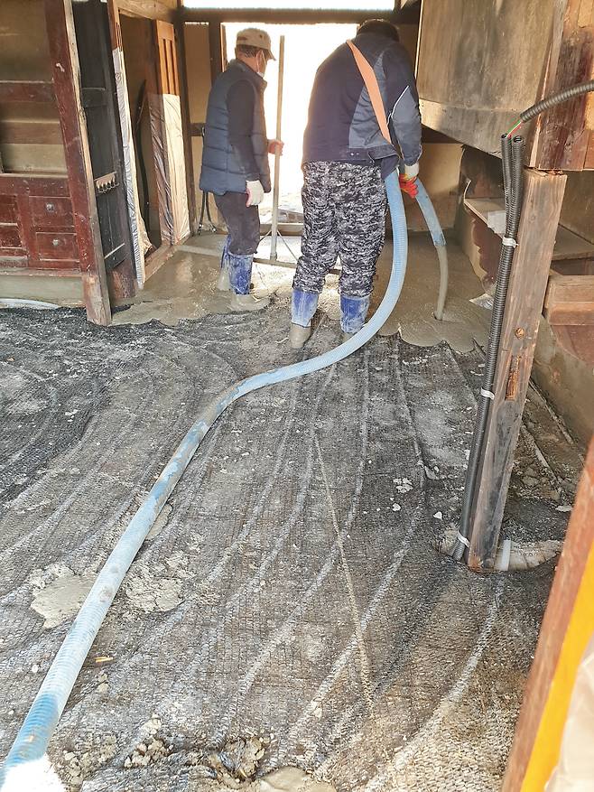 구조공사 및 버림몰탈 타설은 설비공사를 위한 사전작업으로 목구조 틀로 공간을 구획하고, 집 전체 레벨을 다시 한번 체크해 이에 맞춰 버림몰탈을 타설한다.