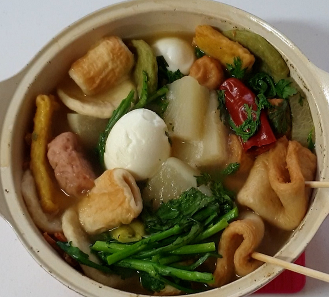 어묵, 육수, 삶은 달걀, 쑥갓,