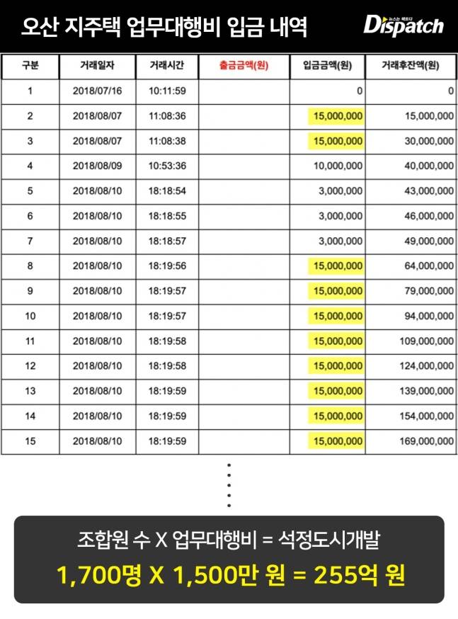 ‘디스패치’는 이창섭의 지난 4년을 추적했다. 먼저, 오산 지주택 사업이다. 석정도시개발은 업무 대행비 명목으로 조합원 1,700명(2019년 10월)에게 각각 1,500만 원을 받았다. 1,700(명)X1,500(만원)=255억 원.