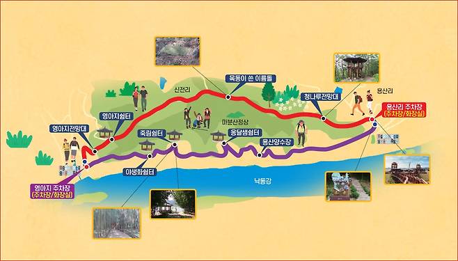 영아지 주차장 → 야생화쉼터 → 죽림쉼터 → 옹달샘쉼터 → 용산양수장 → 용산리 주차장