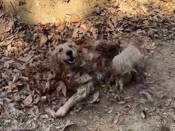 [노트펫] 보호자 속이 타들어 가는 줄도 모르고 신나게 낙엽에 몸을 비비는 리트리버의 모습이 웃음을 주고 있다.