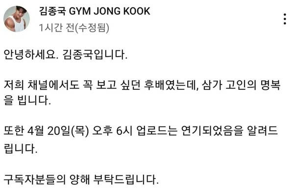 김종국은 "안녕하세요. 김종국입니다"라고 말문을 열며 "저희 채널에서도 꼭 보고싶던 후배였는데, 삼가 고인의 명복을 빕니다"라고 고인을 추모하면서 업로드를 연기했습니다.