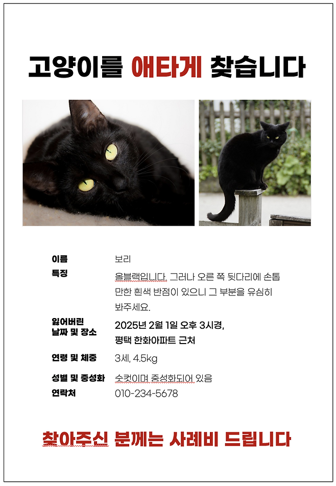 사례비를 명시하면 확실히 제보전화가 많아진다. 사례비는 개인사정에 따라 달라지겠지만 중요한 것은 반드시 고양이를 찾는 일일 것이다.