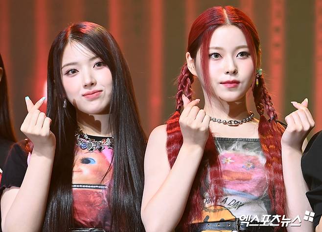 엔믹스 지우, 규진이 포토타임을 갖고 있다.