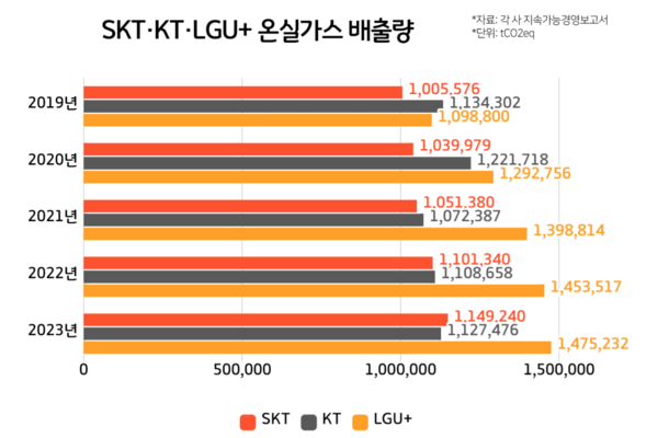 SK텔레콤(SKT)·KT·LG유플러스 등 통신3사가 오는 2050년 탄소중립을 달성한다는 목표를 세웠지만 최근 5년 간 온실가스 배출량은 지속해서 증가한 것으로 나타났다. 인공지능(AI) 수요 증가에 따른 데이터센터 운영 확대와 5G 네트워크 장비 증설로 인해 전기 사용량 증가가 원인이다.
