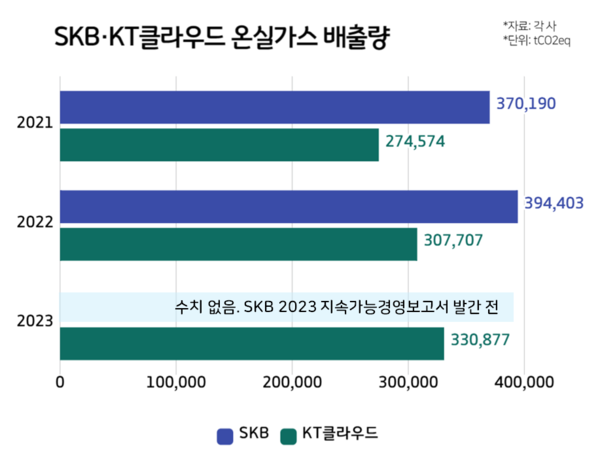 이 때문에 SKB와 KT클라우드의 온실가스 배출량도 지속해서 증가했다. SKB의 2022년 지속가능경영보고서에 따르면 회사의 2022년 온실가스 배출량은 39만4403톤을 기록했다. 전년 대비 약 6.5% 증가한 수치다. 같은 기간 SKT와 SKB의 배출량을 합치면 149만5743톤으로 LG유플러스 보다 많아진다. SKB의 2023년 지속가능경영보고서는 아직 발간되지 않았다.