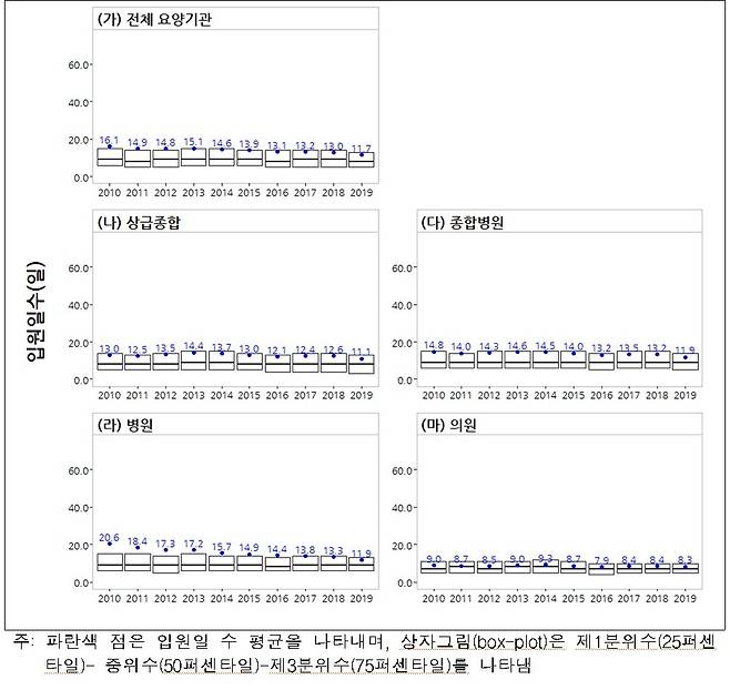 그리고 환자의 특성(성별, 연령, 의료보장유형, 중증도(동반질환), 장애여부)과 기관의 특성을 보정했으나, 입원 기간에 영향을 미칠 수 있는 기타 환자요인(예로 중증도, 의료이용 행태 등)으로 인해 기관 수준의 변이가 높게 나타날 가능성이 있다고 지적했다.