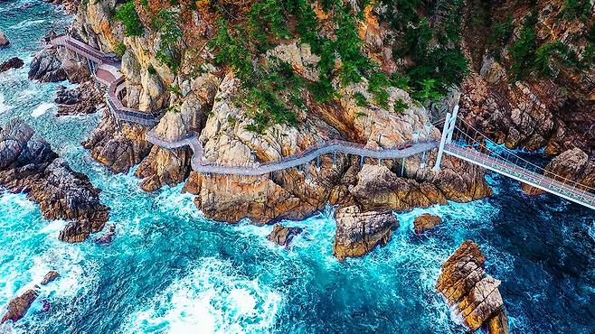 하이라이트인 출렁다리는 바닥 일부가 투명 유리로 되어 있어, 발밑으로 부서지는 파도를 아찔하게 감상할 수 있다.