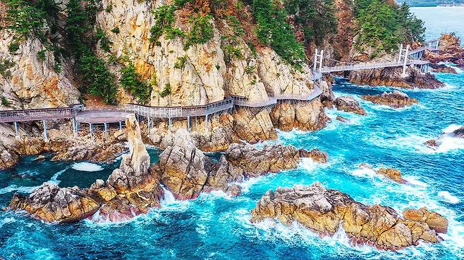 동해안 해변은 어디서나 만날 수 있지만, 수억 년의 세월이 빚어낸 기암괴석과 유리처럼 투명한 바다를 나란히 걷는 경험은 쉽지 않다.
