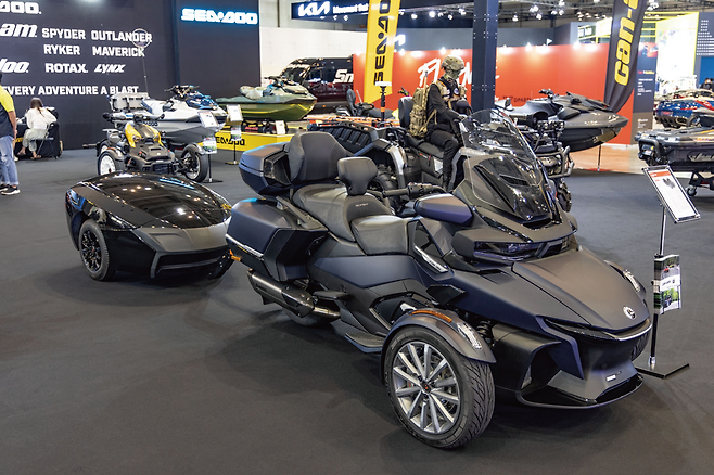 스파이더 시리즈와 오프로드 차량으로 유명한 캔암과 제트스키인 씨두, 스노모빌인 스키두 등 다양한 레저 차량을 선보이고 있는 BRP도 부스를 차려 다양한 라인업의 탈것들을 전시해 관람객의 눈길을 끌었다. 특히 스포티한 디자인에 주행의 재미를 더한 라이커 스포츠모델과 스파이더RT의 최상위 모델인 씨투스카이를 전시했다. 씨투스카이는 캐나다의 시 투 스카이(Sea to Sky) 고속도로에서 따온 이름이다. 177리터의 수납공간과 프리미엄 오디오, 열선 내장 시트와 그립 등 스파이더RT 리미티드의 모든 기능을 포함하며 미스터리 블루 컬러와 전용 12스포크 휠, 전용로고 자수와 허리지지대가 포함된 시트가 포함된다.