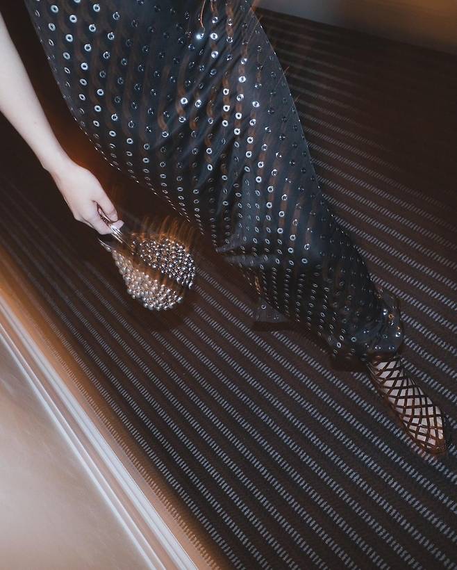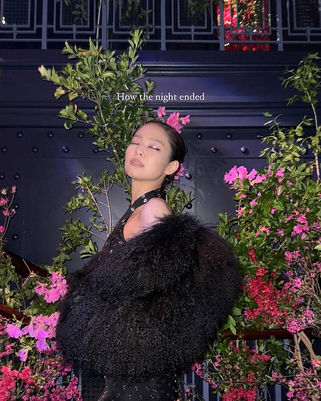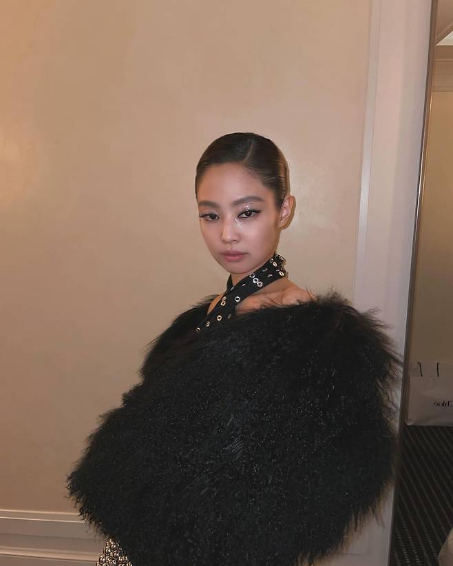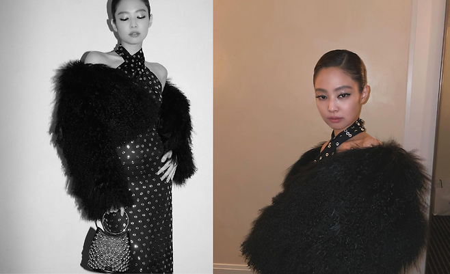 사진 속 제니는 실버 펀칭이 되어 있는 블랙 홀터넥 드레스와 블랙 퍼를 걸쳐 섹시하면서 우아한 모습을 선보였다.