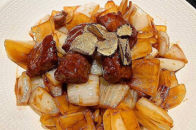 양파가 가득 올려져 있고 1++등급 한우 다섯 덩어리와 위에 트러플로 데코가 되어있는 짜장면! 일반 짜장면 가격의 10배 정도인데 인기가 많아 사람들이 자주 찾는 음식이라고 합니다.