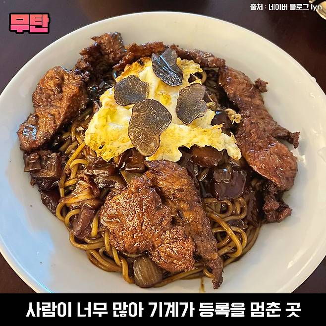 짜장면을 이렇게 웨이팅 해서 먹어본 적은 없는데 무탄의 대표 메뉴인 스테이크트러플짜장면을 먹게 되면 풍미가 깊은 고급스러운 맛에 반하고 온다고 해요. 트러플 오일 외에도 짜장면 위에 트러플 버섯이 함께 조리되어 트러플의 향이 진한 게 특징이랍니다.