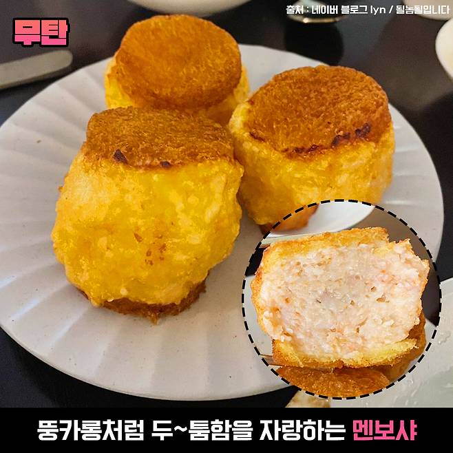 스테이크트러플짜장면 외에도 마카롱 멘보샤가 유명한데 뚱카롱 처럼 멘보샤가 두툼한 마카롱 모양을 하고 있어요. 다른 곳들과는 다른 탱글 한 새우가 꽉 차있는 멘보샤는 무탄에서 즐겨보세요!