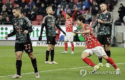 epa11776702 Jae-sung Lee of Mainz celebrates after scoring the 1-0 lead during the German Bundesliga soccer match between 1. FSV Mainz 05 and FC Bayern Munich in Mainz, Germany, 14 December 2024. EPA/RONALD WITTEK CONDITIONS - ATTENTION: The DFL regulations prohibit any use of photographs as image sequences and/or quasi-video.