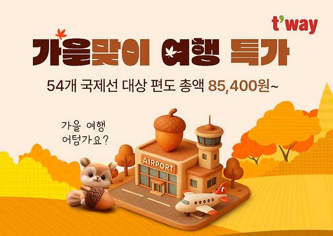 티웨이항공 관계자는 "가을을 맞아 여행을 준비하는 티웨이항공 승객을 위해 이번 프로모션을 준비했다"며 "앞으로도 안전 운항을 최우선으로 하여 다양한 프로모션과 이벤트 진행에 최선을 다하겠다"고 전했다.