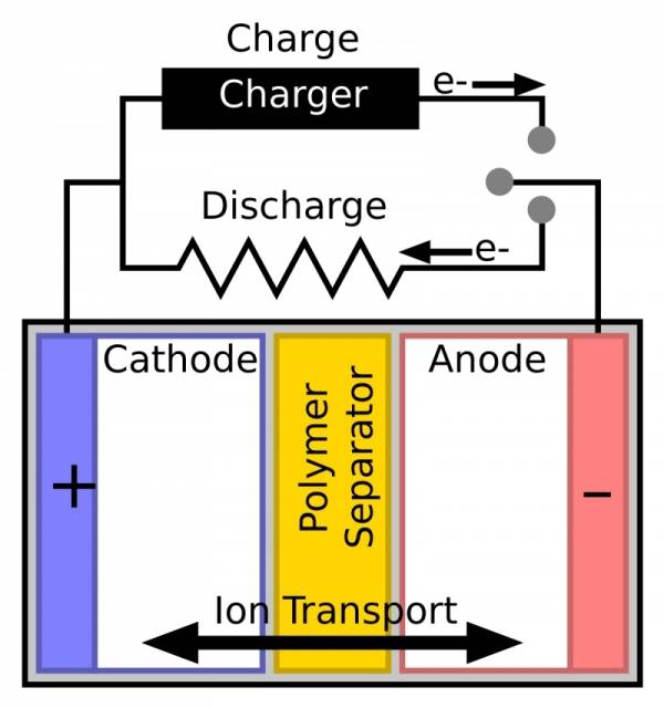 모든 배터리는 기본 구성은 엇비슷하다. 배터리는 전자와 이온이 전해질을 통해 양극, 음극을 오가며 전기 에너지를 받아들이거나 방출한다. 이를 충전과 방전이라 칭한다.