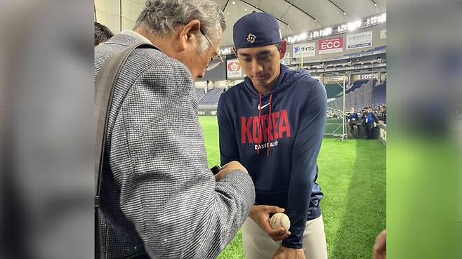 2026 월드베이스볼클래식(WBC) C조 조별리그 한국과 체코의 경기를 앞둔 오늘 일본 도쿄의 도쿄돔에서 한국 야구대표팀의 경기 전 타격 연습 때 한국 더그아웃 앞에 모습을 드러낸 백발의 신사는 이정후(샌프란시스코 자이언츠)가 지나가자 반갑게 말을 걸었습니다.