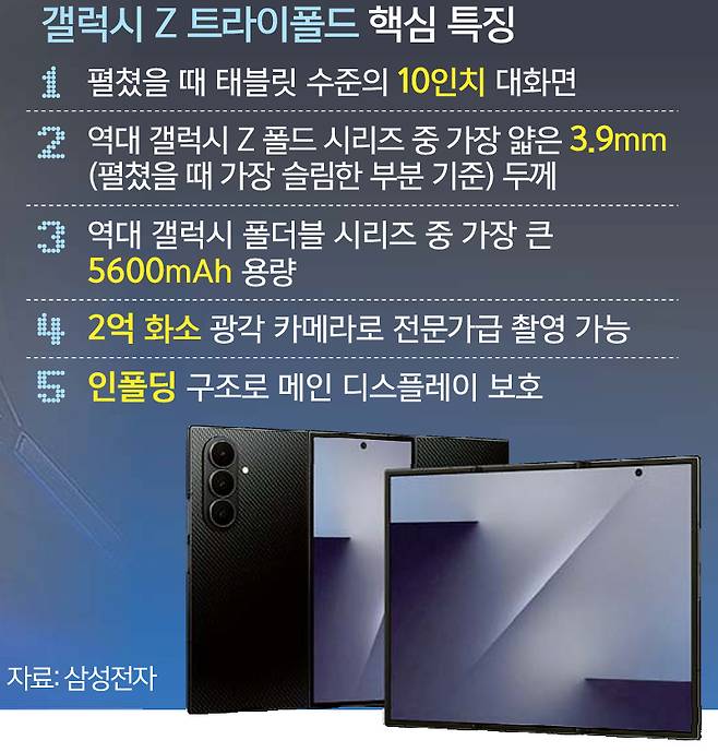 삼성전자가 2일 공개한 ‘갤럭시 Z 트라이폴드’(이하 트라이폴드)는 단순히 두 번 접히는 스마트폰이 아니었다. 스마트폰에선 반비례 관계로 여겨졌던 휴대성과 대화면 경험을 동시에 충족하는 새로운 폼팩터(기기 형태)이자 앞으로 스마트폰이 나아갈 방향을 제시하는 예고편과도 같았다.