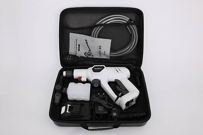 가방 안에 담겨 있는 구성품은 본체와 전용 배터리, 충전 어댑터, 5m 길이의 전용 호스, 각종 노즐과 연장바, 그리고 사용 설명서 등 12종에 달한다.