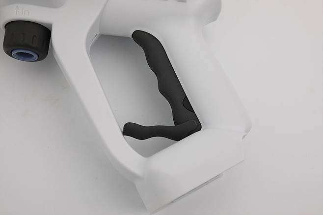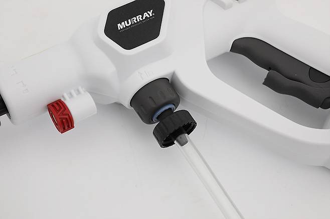 머레이 휴대용 충전식 고압 워터건 WT-GUN의 본체는 이름처럼 총기 형태로 되어 있다. 색상은 백색에 군데군데 검정에 가까운 짙은 회색을 포인트로 집어넣었다.