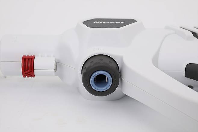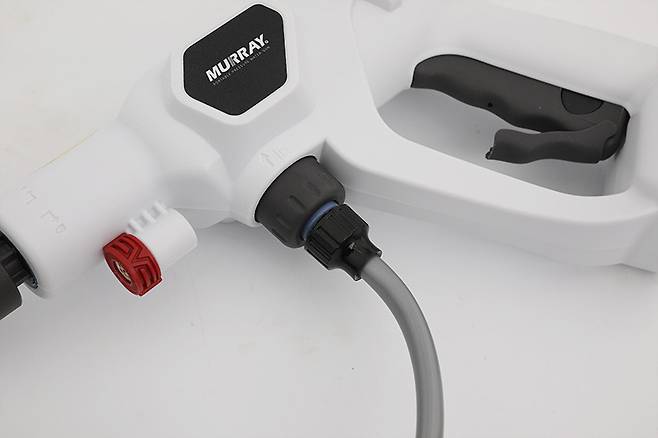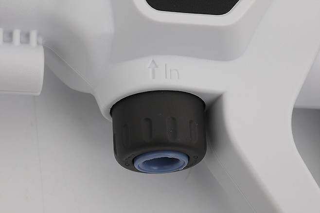 머레이 휴대용 충전식 고압 워터건 WT-GUN을 사용하려면 호스를 연결해 물을 공급해줘야 한다. 본체의 중간 부분에 호스를 연결하는 곳이 있는데, 화살표와 함께 ‘IN’이라는 표시로 물이 유입되는 곳임을 알 수 있다.
