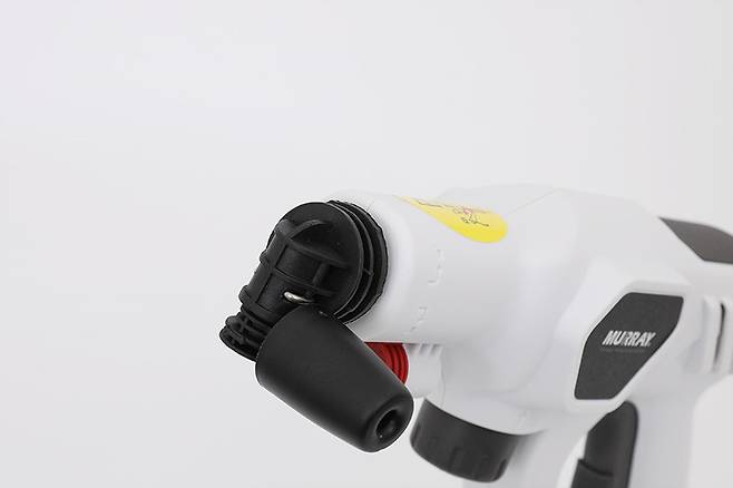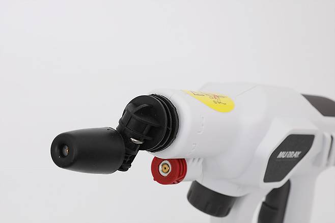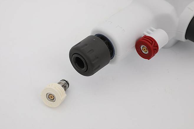 파워 노즐 끝에 장착되어 있는 흰색 노즐은 파워 노즐을 뒤로 누르면 쉽게 분리된다. 바로 아래쪽에 붉은색 노즐이 부착되어 있는 곳은 물이 분사되는 곳이 아니라 노즐을 임시로 보관해두는 용도이다.