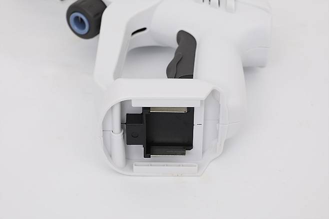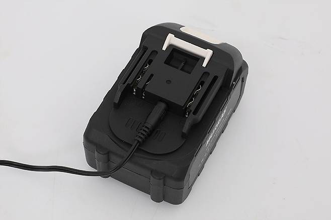 손잡이 아래쪽에는 배터리를 설치하는 공간이 있다. 배터리를 충전한 후 뒤에서 앞쪽으로 밀어서 장착하면 고정되는 방식이다.