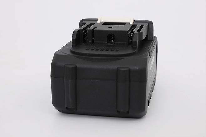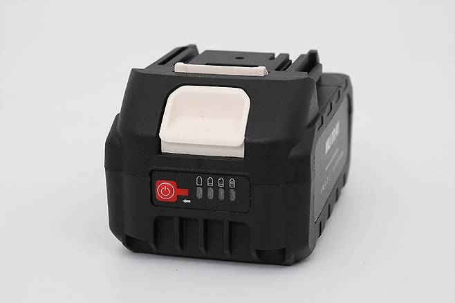 배터리는 18Vdc 5000mAh 용량의 리튬이온 배터리로, 앞쪽에는 배터리 잔량을 확인하는 버튼과 LED가 있고, 그 위에는 배터리를 본체에서 분리하는 버튼이 자리 잡고 있다.