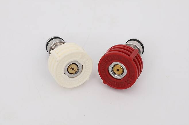 흰색 노즐은 파워 분사 노즐이고, 붉은색 노즐은 파워 직사 노즐이다. 이 두 가지 노즐은 본체에 직접 연결하지 않고 반드시 파워 노즐에 먼저 끼워서 사용해야 한다.