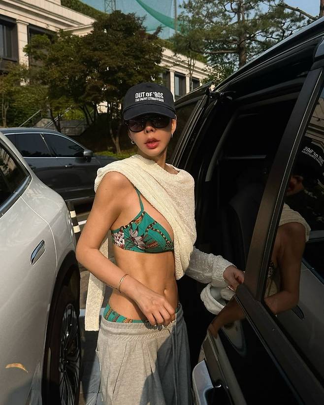 김준희가 ‘내가 좋아하는 여름’이라는 멘트와 함께 공개한 인스타그램 속 패션이 폭발적인 반응을 얻고 있다. 도심 속 자동차 옆에서 포착된 그녀의 모습은 단번에 시선을 사로잡는다. 그 중심에는 탄탄한 복근을 드러낸 트로피컬 프린트 비키니 톱과 루즈한 조거팬츠의 믹스매치가 있다.