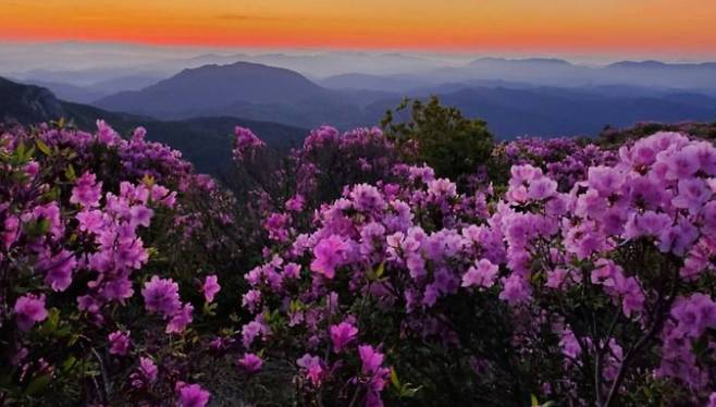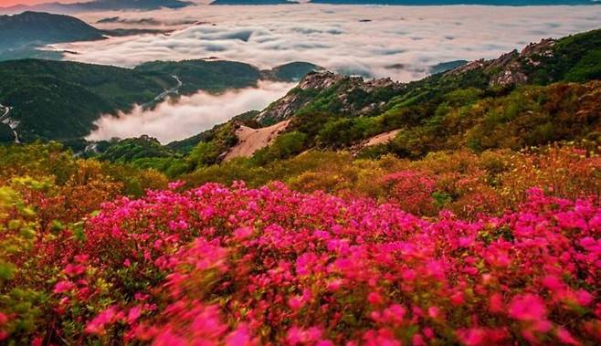 황매산의 철쭉군락지는 전국 최대 규모(약 30ha)로, 자생 철쭉인 산철쭉이 군락을 이루고 있어 일반 철쭉이나 진달래와 차별화됩니다. 특히 4월 중순부터 개화가 시작되어 5월 초 절정을 이루며, 군락 사이 포토 전망 데크에서 감상하는 일출은 장관입니다.