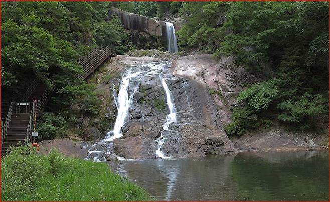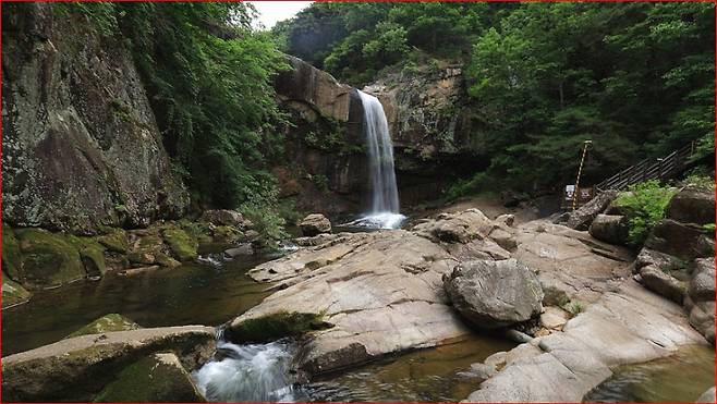 “1단 폭포 밑은 명주실 한 꾸러미가 다 들어가도 바닥에 닿지 않아 용이 살았다는 말이 전해진다.”