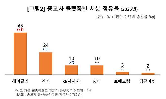 국내 최대 중고차 플랫폼 ‘엔카’가 구입 시장에서 독보적 1위를 유지하고 있으나 처분 시장에서는 ‘헤이딜러’의 약진에 밀려 입지가 계속 줄고 있다. 대중적 인지도가 높은 ‘보배드림’과 ‘당근마켓’은 이 시장 점유율이 2~3%에 머물고 있는데, 고가품 거래에 필수적인 신뢰성과 정보의 투명성이라는 진입 장벽을 넘지 못한 때문이다.