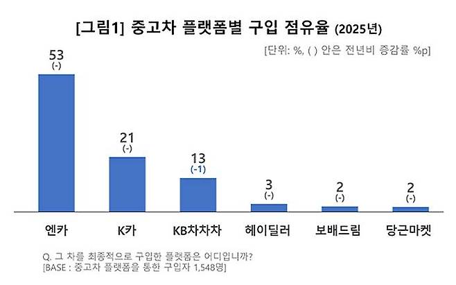 ○ 중고차 구입 시장에서는 엔카가 점유율 53%로 확고한 선두를 지켰고, 다음은 K카(21%)와 KB차차차(13%) 순이었다[그림1]. 이들 상위 3개 플랫폼의 순위는 전년과 동일했고 점유율도 거의 변화가 없었다. 이어 큰 차이를 두고 헤이딜러(3%), 보배드림과 당근마켓(각각 2%)이 자리했고, 나머지는 모두 1% 이하 점유율에 머물렀다. 상위 3사의 점유율 합계가 87%에 달하는 과점 상태의 시장이다.