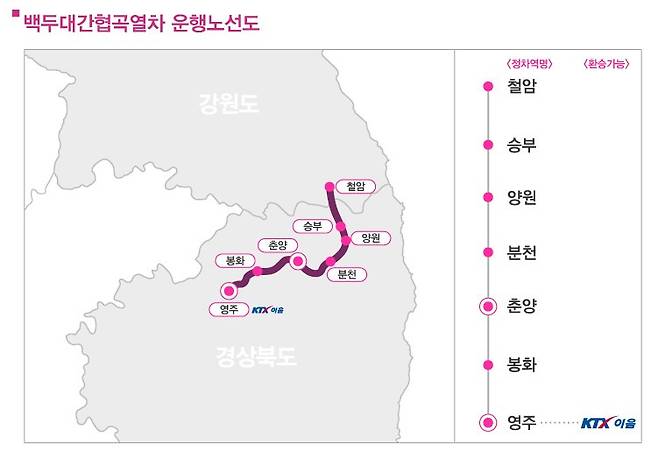 백두대간협곡열차는 영주에서 출발하여 봉화, 춘양, 분천, 양원, 승부, 철암까지 가는 코레일 관광 열차입니다. 영주-철암까지의 풀코스가 있고, 분천-철암역을 운행하는 코스도 준비되어 있습니다.