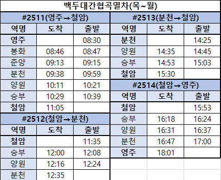 2025년 1월 1일부터는 화요일과 수요일 휴무로 변경되었습니다. 또한 영주에서 철암까지의 구간은 하루 1회 운행되며, 분천에서 철암까지의 구간은 하루 2회 운행됩니다.