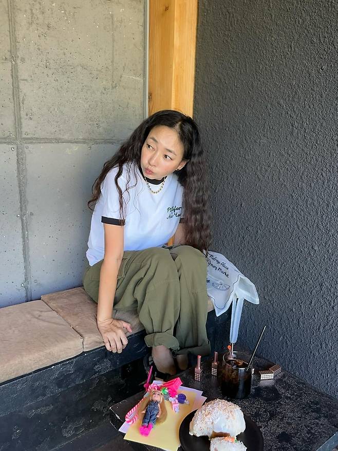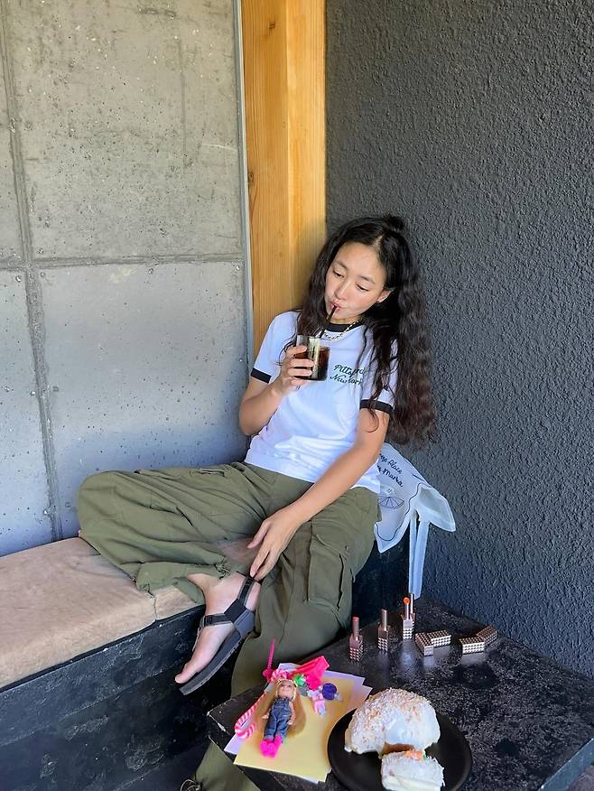 테이블 위엔 무심하게 놓인 바비 인형과 흘러내릴 듯한 크림 번, 그리고 진재영의 표정이 묘하게 어우러지면서, 마치 작은 컨셉 화보처럼 보였어요.