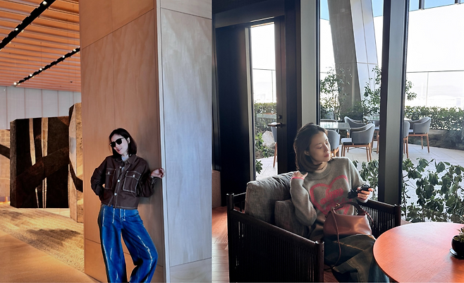 모던한 갤러리 공간에서 문채원이 브라운 컬러의 오버사이즈 재킷과 블루 데님 팬츠를 매치한 스트리트 캐주얼 룩을 선보이고 있다. 화이트 스티치가 돋보이는 재킷의 포켓 디테일과 와이드한 실루엣의 데님 팬츠가 트렌디한 감각을 드러내고 있다. 블랙 선글라스와 짧은 단발 헤어스타일로 도시적인 세련미를 완성하며, 갤러리의 우드 톤 인테리어와 조화를 이루는 스타일링을 연출하고 있다.